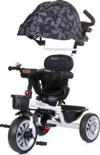 Multifunkčný výrobok Chipolino Trojkolka so strieškou Matrix Ebony s 2 rôznymi spôsobmi použitia - rodič tlačí dieťa alebo dieťa samo riadi hračku pomocou pedálov.