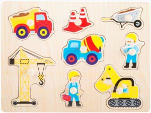 Detská vkladačka z dreva s motívmi obrázkov stavebných strojov a potrieb pre stavbárov.