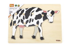 Drevená vkladačka s motívom kravy. Rozmer drevenej dosky cca 30 x 22,5 x 1 cm cm. Vek 18 mes +