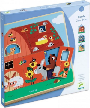 Trojvrstvové drevené puzzle s 12 dielikmi, kde deti postupne odkrývajú a skladajú príbeh zvieratiek zo statku.