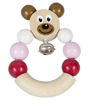 Drevená hrkálka s medvedíkom v ružovej farbe.