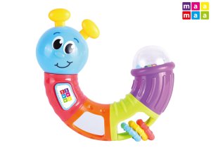 Roztomilá hrkálka v tvare tamburíny vie dieťatko jednoducho uchopiť a zatriasť ním.