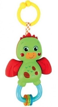 Farebná hrkálka v podobe malého dráčika s mäkkými a bezpečnými gumovými prvkami. praktické pútko na zavesenie krídielka slúži ako hryzátko tri pohyblivé krúžky stimuluje zmyslové vnímanie