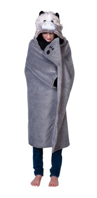 Zábavná, mäkučká, hrejivá deka s kapucňou s motívom zvieratka a dvoma rohovými vreckami na ruky s motívom zvieracích labiek.