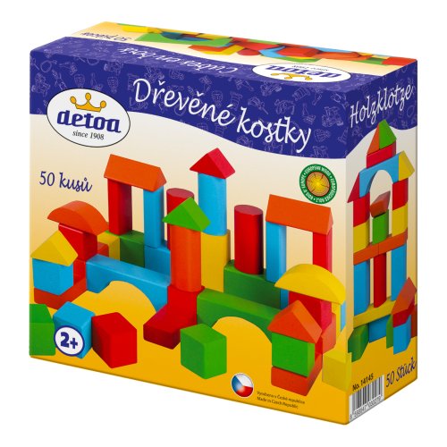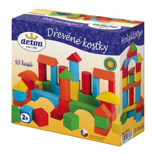 Farebná stavebnica obsahuje 50 kusov drevených kociek rôznych tvarov. Valčeky-5,5x2,5 cm, kvádre-5,5x2,5 cm, kocky -2,5x2,5 cm. Nevhodné pre deti do 2 rokov. Obsahuje malé časti . Hlavné vlastnosti: stavebnica pomáha rozvíjať detskú predstavivosť a motoriku rúkvýrobok spĺňa požiadavky EÚ na bezpečnosť hračiek vhodný pre deti od 2 rokov