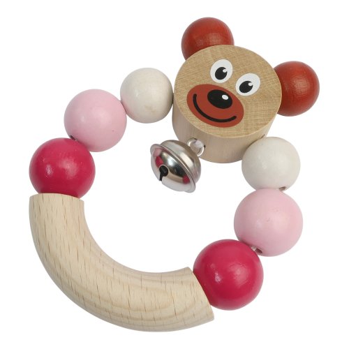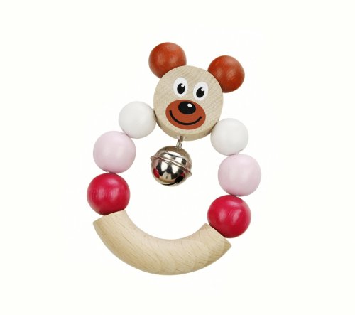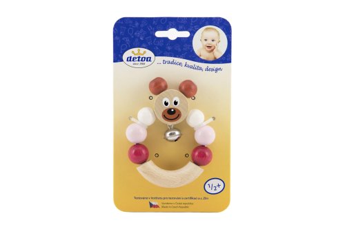 Hrkálka s medvedíkom v ružovej farbe. Rolnička jemne cinká. Hrkálka má nízku hmotnosť a je vhodné pre deti od 6tich mesiacov. Výrobok spĺňa požiadavky EÚ na bezpečnosť hračiek. Rozmery výrobku sú 70x90 mm a je pripevnený na papierovej karte. Rozmery balenia 10,5 x 17 x 2 cm.
