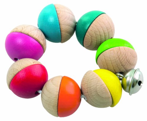 Hrkálka z farebných a prírodných půlkorálků s rolničkou. Rolnička jemne cink. Hrkálka má nízku hmotnosť a je vhodné pre deti od 6tich mesiacov. Výrobok spĺňa požiadavky EÚ na bezpečnosť hračiek. Priemer výrobku je 80mm a je pripevnený na papierové karte. Rozmery balenia 10 x 17 x 2,5 cm.