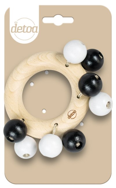 Drevená ľahká hrkálka s čiernobielymi guličkami na šnúrke pomáha rozvíjať jemnú motoriku rúk a je vhodná pre deti od 6tich mesiacov. Výrobok spĺňa požiadavky EÚ na bezpečnosť hračiek. Priemer krúžku je 7 cm a je pripevnený na ekologickej papierovej karte. Hlavné vlastnosti: precvičuje jemnú motorikuvýrobok je zdravotne nezávadnýspĺňa všetky normy EÚ pre bezpečnosť hračiekpriemer krúžku je 7 cm a je pripevnený na papierovej kartevyrobené v Českej republike