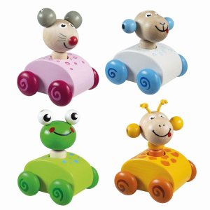 Drevené pískacie zvieratká na kolieskach - assort 4ks - žirafa, žabka, myška, ovečka. Pri stlačení zvieratka sa ozve zapískanie.