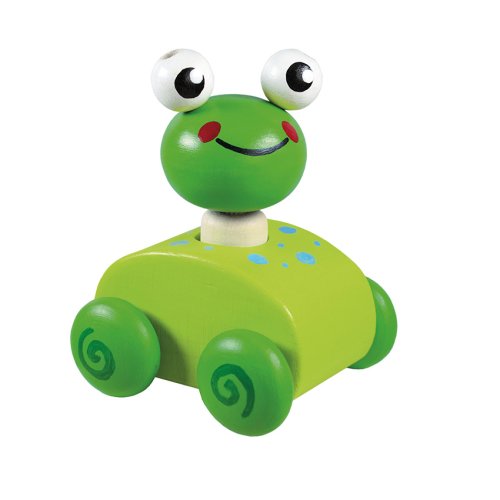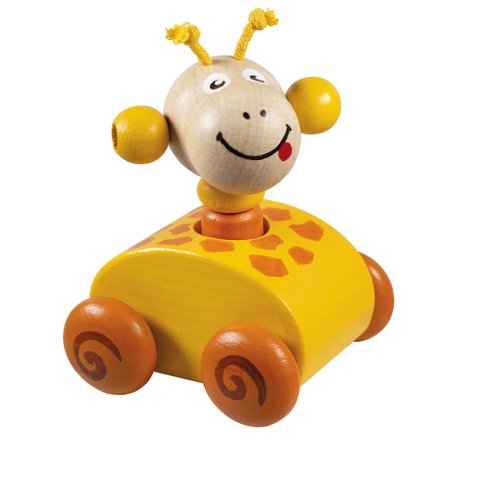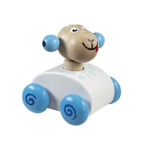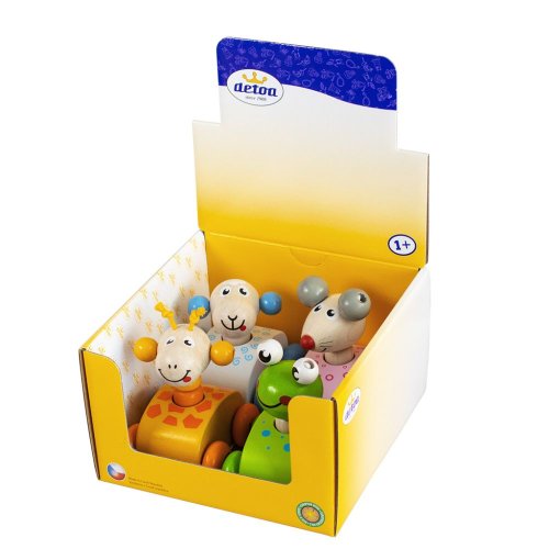 Drevené pískacie zvieratká na kolieskach - séria 4ks - žirafa, žabka, myška, ovečka. Pri stlačení zvieratka sa ozve zapískanie.