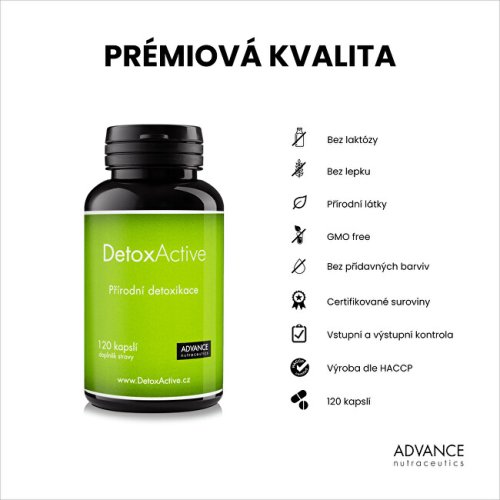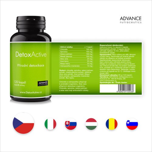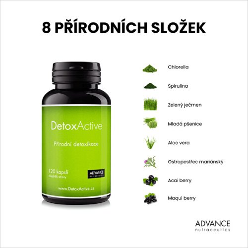 DetoxActive je doplnok stravy vo forme kapsúl obsahujúci unikátnu kombináciu prírodných látok, ktoré podporujú detoxikáciu organizmu - chlorellu, spirulínu, zelený jačmeň a mladú pšenicu s extraktmi acai, maqui berry, aloe vera a pestreca mariánskeho.