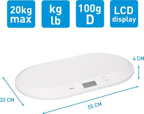 Digitálna detská váha meracia hmotnosť veľmi presne. Váhu môžete pohodlne odčítať na digitálnom LCD displeji. Detská váha má rozsah od minimálne 10 gramov do maximálne 20 kg. To znamená, že ho môžete používať, pokiaľ vaše dieťa nebude približne malé dieťa. Váha zobrazí správu "O-LD" (´overload´), pokiaľ hmotnosť prekročí maximum 20 kg. Môže zobrazovať hmotnosť v kilogramoch, môžete ju ale tiež nastaviť na ukazovateľ v librá ch. Vrátane batérií. Digitálna detská váha funguje s 2 batériami AAA (súčasťou dodávky). Má tlačidlo zapnutia/vypnutia a po určitej dobe sa sám vypne, aby šetril energiu. Dostanete tiež správu, ak sú batérie slabé. V takom prípade sa na displeji zobrazí "LO". Špecifikácia detskej váhy Grundig Vhodné pre bábätká a deti do 20 kg. Funguje s 2 batériami AAA (súčasťou dodávky). S digitálnym LCD displejom. Presnosť: 10 gramov Jednotka: kilogramy a libry S funkciou tárovania .S tlačidlom ZAP/VYPAutomaticky sa vypne.