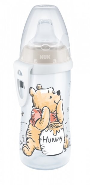 Detská fľaša NUK Activ Cup s atraktívnym motívom obľúbeného medvedíka Pú. Fľaša veľmi ľahká, odolná a nerozbitná, opatrená silikónovým nekvapkajúcim náustkom, ktoré zabraňuje vyliatiu nápoja. Má praktické viečko, aby zostal náustok čistý. S klipom na upevnenie za opasok pre väčšie deti. Široké hrdlo fľaše umožňuje jej ľahké čistenie. Hlavné vlastnosti: extra ľahká vyrobená z pevného a nerozbitného polypropylénu vhodná pre deti od 6 mesiacov s klipom na upevnenie za opasok klinicky testované bez obsahu BPA.