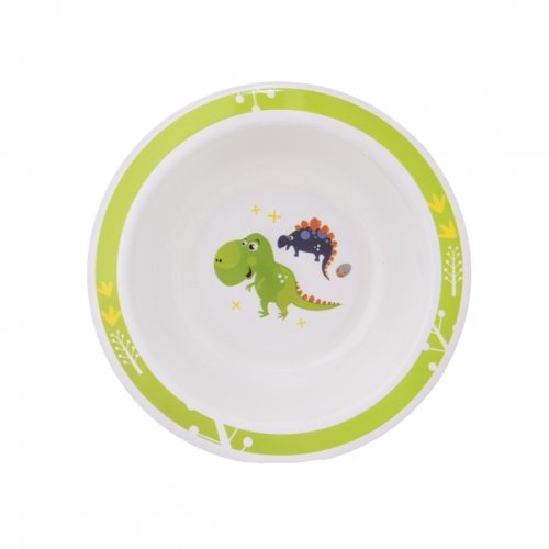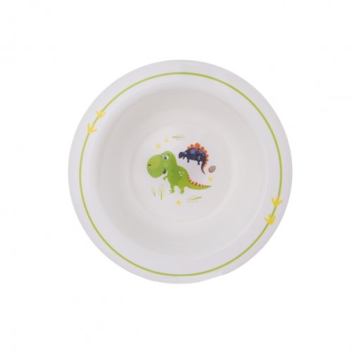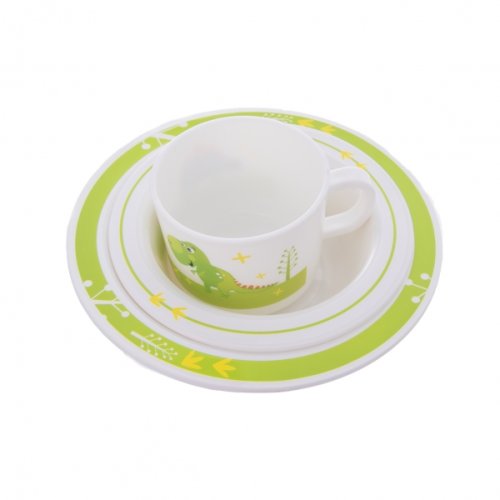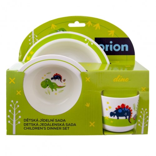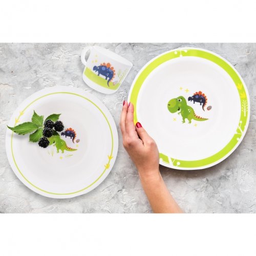 Sada jedálenská detská s dekorom DINOSAURA. Súprava obsahuje 2 hlboké misky a hrnček. Darčekové balenie. Materiál kvalitný plast, testované v akreditovanom laboratóriu SR podľa vyhlášky. Hrnček 250 ml, priemer 8 cm, výška 8 cm, misa priemer 14 cm, výška 4 cm, miska priemer 17.5 cm, výška 3.3 cm. Riad je možné umývať v umývačke riadu, možnosť použitia v mikrovlnke. EAN 8592381158323