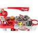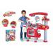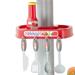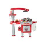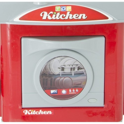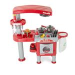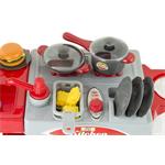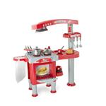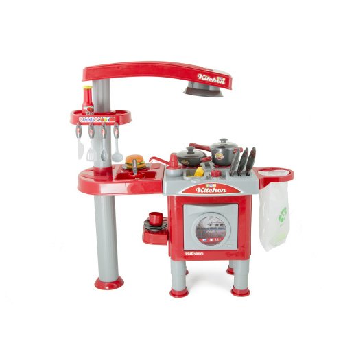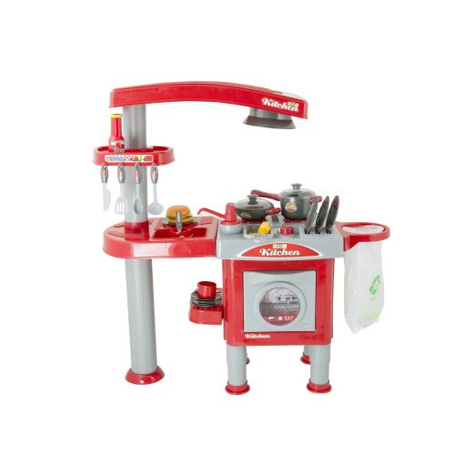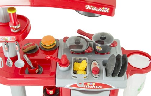 Detská červená kuchynka G21 je plne vybavená spotrebičmi, riadom a dokonca jedlom . Nechýba ani kôš na odpadky .