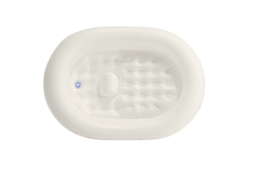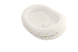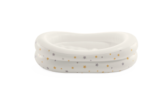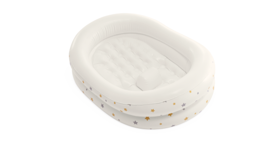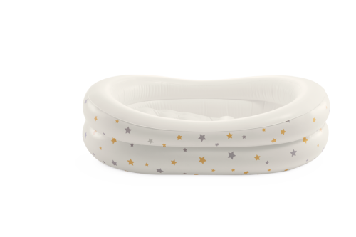 Dětská nafukovací vanička Starry je navržena tak, aby poskytovala bezpečné a komfortní prostředí pro koupání nejmenších dětí. Vanička má oválný tvar s dostatečně prostorným vnitřkem, který je vyroben z měkkého a příjemného materiálu, jenž je šetrný k citlivé dětské pokožce. Povrch vaničky je bílý s jemným potiskem hvězdiček v odstínech zlaté a šedé, což jí dodává hravý a zároveň elegantní vzhled. Vnitřní část vaničky je opatřena nafukovacím podpůrným výstupkem, který je umístěn tak, aby zabránil sklouznutí miminka během koupání. Dno je rovněž nafukovací a díky své mírné strukturovanosti poskytuje dodatečný komfort a stabilitu. Díky těmto prvkům je koupání bezpečné a pohodlné jak pro dítě, tak i pro rodiče, kteří mohou mít jistotu, že jejich dítě je dobře podepřeno. Vanička je velmi lehká a snadno přenosná, což ocení rodiče při cestování nebo při přenášení mezi místnostmi. Součástí balení je ruční pumpa, která usnadňuje nafouknutí i vyfouknutí vaničky, což výrazně zjednodušuje její přípravu a údržbu. Celkově je tato nafukovací vanička vhodná pro venkovní i domácí použití, zejména v letních měsících, kdy může sloužit jako praktická alternativa ke klasickým dětským vaničkám. Minimální věk: do 1 roku
