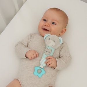 Hrkálka má zaujímavé tvary a výrazné farby, ktoré priťahujú pozornosť dieťaťa. Obsahuje zvukové prvky ako pískatko a hrkálku, ale aj hryzátko, ktoré uľavuje počas rastu zúbkov. Hračka tak nielen baví, ale taktiež podporuje rozvoj koordinácie zraku a pohybu, sluchu a hmatu.