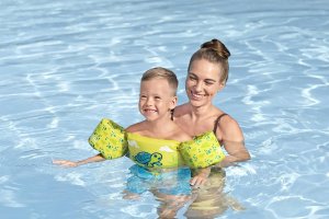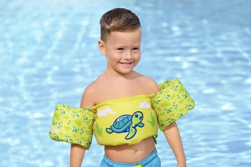 Bestway® Puddle Jumper® Detská plávacia vesta s korytnačím motívom. Plavecká pomôcka pomáha malým deťom vo veku od 2 do 6 rokov naučiť sa základom plávania a získať bezpečnosť v bazéne. Inovatívny dizajn záchrannej vesty a vodných krídeliek zaisťuje, že deti zostanú bezpečne na vodnej hladine. Textilný poťah je vyrobený z hladkého, pevného a pohodlného polyesterového materiálu. Vesta má tiež integrované penové polstrovanie a nastaviteľný popruh so zapínaním. Naučiť sa plávať nikdy nebolo tak zábavné a bezpečné. Obvod hrudníka: 56 cm. Maximálna nosnosť: 15-30 kg. Rozmery balenia: 46 x 38 x 12 cm. Používajte iba pod dohľadom dospelej osoby. Vek: 2+