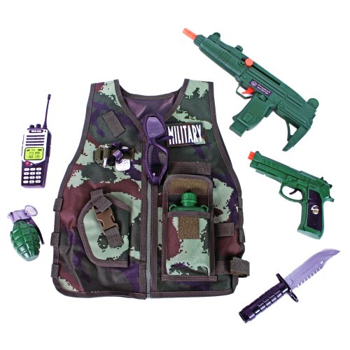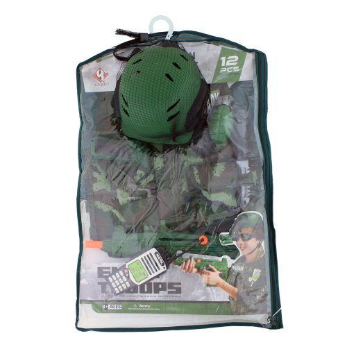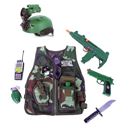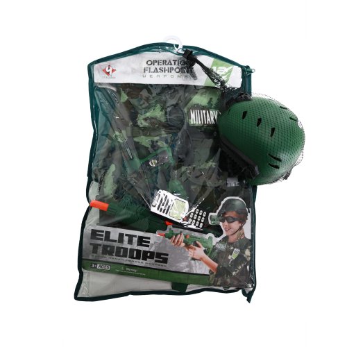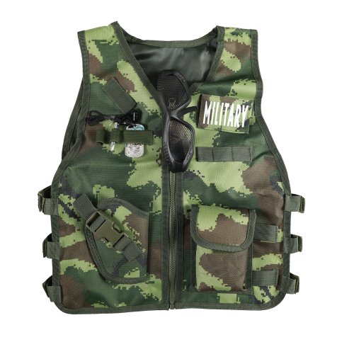 Vydaj sa na vojenskú misiu s týmto parádnym vybavením! Karnevalový kostým je určený pre chlapčekov vo vekovom rozmedzí 3-7 rokov (104-122 cm). Balenie obsahuje vestu, prilbu so svetlom (2 ks batérií typu LR44, ktoré sú súčasťou balenia), granát, poľná fľaša, nôž, samopal, pištoľ, okuliare, vysielačku a ďalšie drobnosti.