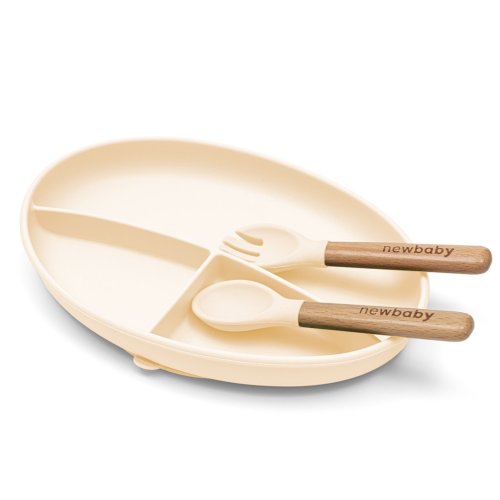 - Lyžičku a vidličku s drevenou rukoväťou a jemným gravírovaním loga New Baby (dĺžka 14 cm) – príjemné na dotyk a prispôsobené malým ručičkám.