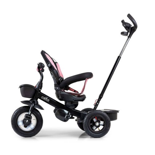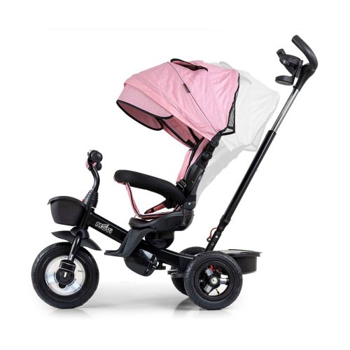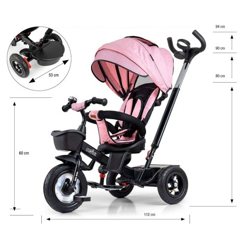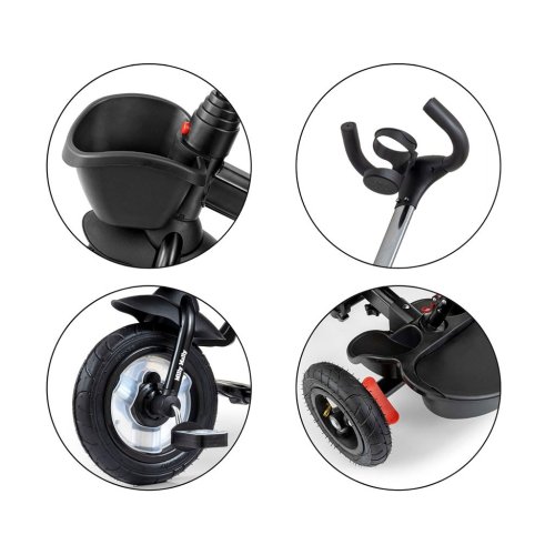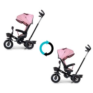 Je vyrobená z kvalitných a odolných materiálov. Má moderný konštrukciu, pohodlné a ergonomicky tvarované sedadlo, ktoré je otočné o 360 stupňov, čo umožní dieťaťu cestovať v smere alebo proti smeru jazdy. O pohodlie a bezpečie počas jazdy sa stará bariérky, trojbodové bezpečnostné pásy, pohodlné stúpačky alebo veľké nafukovacie kolesá, ktoré skvele absorbujú rázy a poskytujú dobrú priľnavosť. Trojkolku môže ovládať ako dieťa, tak aj rodič pomocou nastaviteľné rukoväte pre tlačenie. Po odobratí vodiace tyče, sklápacie striešky, ktorá chráni pred slnkom alebo ostatných komponentov bude slúžiť ako trojkolka. Trojkolku je možné používať aj ako alternatívu golfového kočíka. Pre uloženie hračiek alebo potrieb pre dieťa je tu praktický úložný košík.