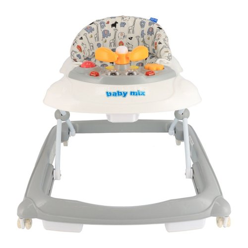 Multimediálne chodítko Baby Mix so silikónovými kolieskami. Chodítko je vybavené pohodlným ergonomicky tvarovaným sedadlom, ktoré zaisťuje správne držanie chrbtice. Multimediálny panel obsahuje rôzne svetelné efekty, trúbiaci volant, ktorým je možné otáčať, tlačidlá pre prehrávanie melódií a dve svetlá. Krásne chodítko s hračkami očarí malých objaviteľov a umožní im hrať sa ešte dlhšie. Chodítko je vybavené špeciálnym systémom proti prevráteniu, ktorý zaistí Vášmu dieťaťu pohodlie a bezpečnosť.