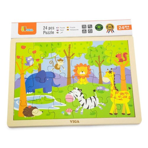 Drevené puzzle s obrázkom zoo. Celkom 24 dielikov. Rozmery obrázku cca 27,5 x 20 cm. Rozmery balenia cca 30 x 27 x 1 cm. Vek 24m+