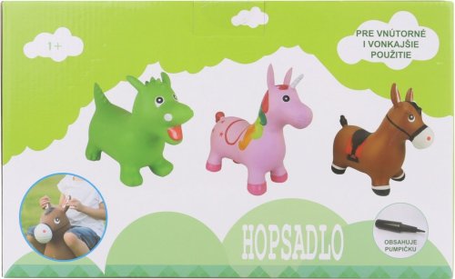 detské hopsadlo z kvalitného gumového materiálu (PVC) je vhodné pre vnútorné aj vonkajšie použitie, uši slúžia ako držadlá pre lepšiu stabilitu dieťaťa pri hopsaní, súčasťou balenia je nafukovacia pumpička.