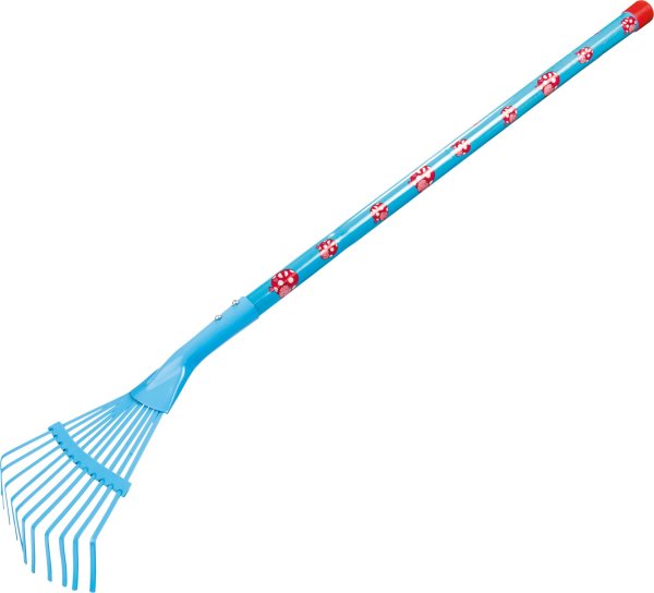 Veľmi kvalitné a plne funkčné detské hrabličky - s kovovými lamely v modrej farbe s farebnou násadou s detskými motívmi.