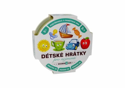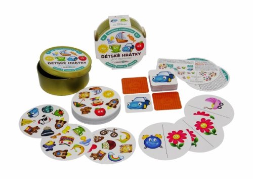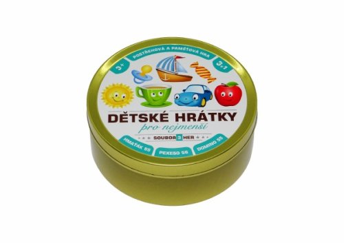 Zábavná kartová postrehová hra balená v malej plechovej krabičke. To sú Detské hrátky, ktoré obsahujú tri zábavné kartové hry: Hmaťáka, Domino a Pexeso. Deti si zábavnou formou zlepšujú postreh a pamäť. Jednoduché pravidlá a krásne maľované obrázky. Rozmery výrobku 10 x 10 x 4 cm. Vhodné pre deti od 3 rokov.