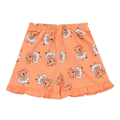 Dievčenské bavlnené pyžamko českej značky New Baby Dream s medvedíkom. Letné pyžamko sa skladá z trička s krátkym rukávom a kraťasov. Tričko s volánikmi zdobí na prednej strane roztomilý obrázok medvedíka na obláčiku a hviezdičiek. Zapínanie na cvočky na ramienku. Kraťasy sú celopotlačené medvedíkmi a na nohavičkách majú roztomilé volániky. V páse je širší lemom s gumičkou, ktorý netlačí na bruško bábätka. Vhodné aj ako detské letné oblečenie. Zloženie: 100% bavlna.