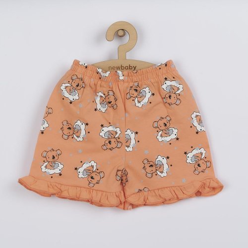 Dievčenské bavlnené pyžamko českej značky New Baby Dream s medvedíkom. Letné pyžamko sa skladá z trička s krátkym rukávom a kraťasov. Tričko s volánikmi zdobí na prednej strane roztomilý obrázok medvedíka na obláčiku a hviezdičiek. Zapínanie na cvočky na ramienku. Kraťasy sú celopotlačené medvedíkmi a na nohavičkách majú roztomilé volániky. V páse je širší lemom s gumičkou, ktorý netlačí na bruško bábätka. Vhodné aj ako detské letné oblečenie. Zloženie: 100% bavlna.