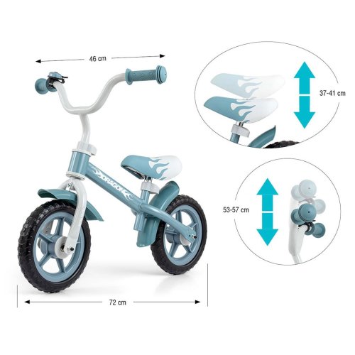Detské odrážadlo-bicykel Milly Mally Dragon je ideálny, keď sa dieťa učí udržať rovnováhu. Je tou najlepšou alternatívou pre bicykel s bočnými kolieskami, takže neskoršia jazda na klasickom kolese bude oveľa jednoduchšia. Bicykel je bez pedálov, vďaka čomu sa dieťa dokáže sústrediť hlavne na držanie rovnováhy a smer jazdy.