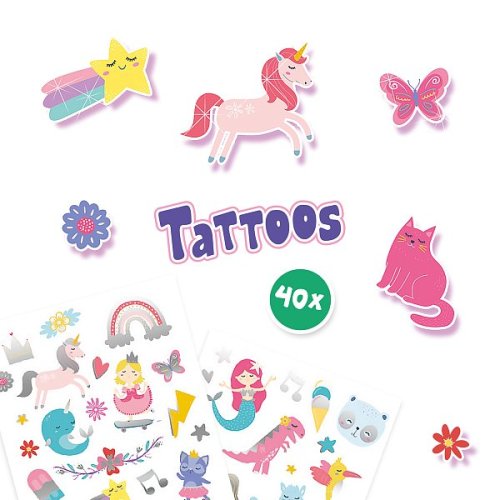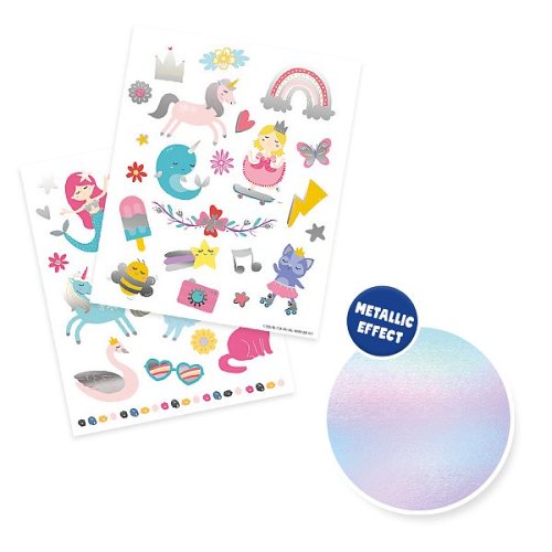 Úžasné tetovanie s metalickým efektom rozžiaria deťom deň. Vyberú si odvážnu princeznú na skateboarde, alebo si na ruku nalepia krásneho jednorožca? Súprava obsahuje 40 veselých a roztomilých motívov. Tetovanie sa ľahko nanáša a rovnako jednoducho sa zmýva z pokožky. Rozprávková téma s vtipnými ilustráciami. Kozmeticky testované. Rozmery balenia: 20 x 15 x 0,5 cm. Vek: 3+