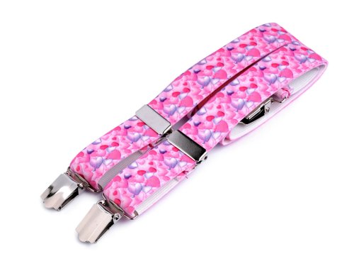 Detské traky s dĺžkou 70 cm a šírkou 2,5 cm s rôznymi potlačami, ktoré sa neodierajú ani nelúpu. Originálne balenie obsahuje 10 ks trakov v rôznych farbách a motívoch. Ide o kvalitný český výrobok. Prichytávajú sa pomocou kovových žabiek, sú vyrobené zo 100% polyesteru. [Traky sú určené pre výšku postavy 120 - 140 cm.]