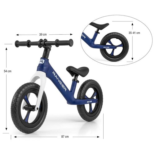 Odolná a vyrobená najnovšou technológiou EVA peny, 12" kolesá odolné proti prepichnutiu, ktoré nie je potrebné nafukovať, sú bezúdržbové. Ergonomické, výškovo nastaviteľné sedlo s mäkkou výplňou zaisťuje dieťaťu pohodlie pri jazde a rastie s dieťaťom. Bicykel Ranger má riadidlá v guličkových ložiskách, rovnako kolesá s guličkovými ložiskami. Protišmykové rukoväte z mäkkej gumy zaisťujú pevné uchopenie a pohodlné vedenie.