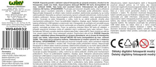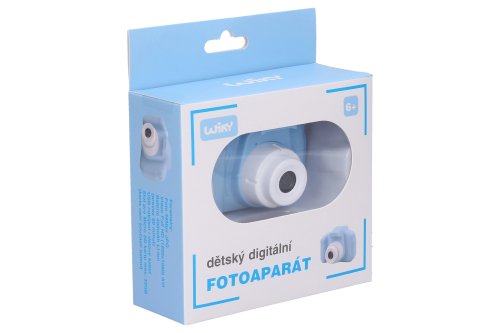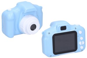 Detský digitálny fotoaparát modrý - foto 48 Mpx, video Full HD. Rozmery 8,3x5x6 cm. Rozlíšenie fotografií 48 megapixelov, videá Full HD (1920x1080). Časovač, vloženie času, digitálny zoom, rôzne efekty (rámčeky, vložené animácie, deformácie, filtre) fotografií, hry, mp3 prehrávač, 2,0 palcový displej. Vstavaná 400mAh Li-ion batéria, USB kábel a popruh súčasťou. Formát fotografií jpg, videá avi. Prevádzka 80-150 min. Kompatibilný s micro SD kartami - max. 32GB. Pamäťová karta nie je súčasťou.