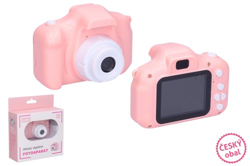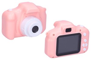 Detský digitálny fotoaparát ružový - foto 48Mpx, video Full HD. Rozmery 8,3x5x6 cm. Rozlíšenie fotografií 48 megapixelov, videá Full HD (1920x1080). Selfie kamera, časovač, vloženie času, digitálny zoom, rôzne efekty (rámčeky, vložené animácie, deformácie, filtre) fotografií, hry, mp3 prehrávač, 2,0 palcový displej. Vstavaná 400mAh Li-ion batéria, USB kábel a popruh súčasťou. Formát fotografií jpg, videá avi. Prevádzka 80-150 min. Kompatibilný s micro SD kartami - max. 32GB. Pamäťová karta nie je súčasťou.