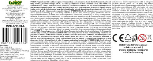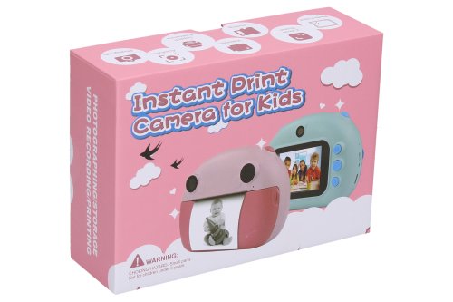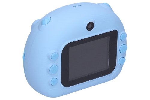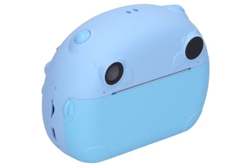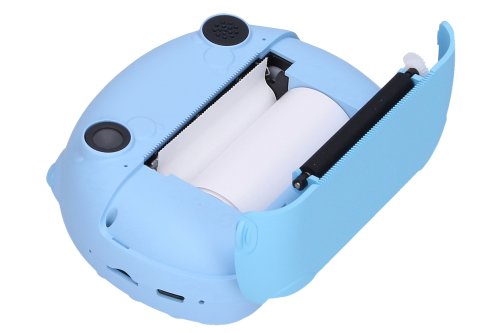 Detský digitálny fotoaparát s tlačiarňou modrý - foto 12Mpx, video Full HD. Rozmery 11x4,5x8,5 cm. Rozlíšenie fotografií 12 megapixelov (4800x2656), videá Full HD (1920x1080). Nastavenie kvality tlače. Selfie kamera, časovač, sériové snímanie, vloženie času, rôzne efekty (rámčeky, vložené animácie, filtre) fotografií, hry, mp3 prehrávač, 2,4 palcový displej. Zvlášť tlačidlá na fotenie, na natáčanie videa, na tlač fotografií. Vstavaná 750mAh batéria, prevádzka 180 min, USB kábel súčasťou. Šírka fotopapiera 5,5 cm, potlačiteľná šírka 4,8 cm. 2 role fotopapiera a popruh súčasťou. Kompatibilný s micro SD kartami - max. 32 GB. Pamäťová karta nie je súčasťou.