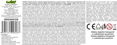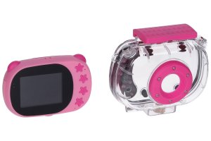 Detský digitálny fotoaparát s vodotesným puzdrom - foto 20Mpx, video Full HD. Rozmery 8x2,5x5,5 cm. Výklopný objektív - slúži aj ako selfie kamera. Rozlíšenie fotografií 20 megapixelov, videá Full HD (1920x1080). Kamera predná/selfia, časovač, sériové snímanie, digitálny 10x zoom, vloženie času, rôzne efekty (rámčeky, vložené animácie, filtre) fotografií, hry, mp3 prehrávač, 2,0 palcový displej. Vstavaná Li-ion batéria, USB kábel, popruh a vodotesné puzdro súčasťou. Formát fotografií jpg, videá avi. Vodotesné puzdro určené maximálne do hĺbky 10 m. Prevádzka 100 min. Kompatibilný s micro SD kartami - max. 32GB. Pamäťová karta nie je súčasťou.
