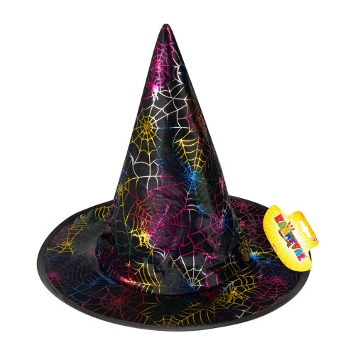 Veselý halloweensky klobúk je skvelým doplnkom na besiedku alebo karneval! Klobúk čiernej farby je zdobený farebnou pavučinkou.