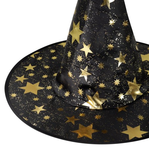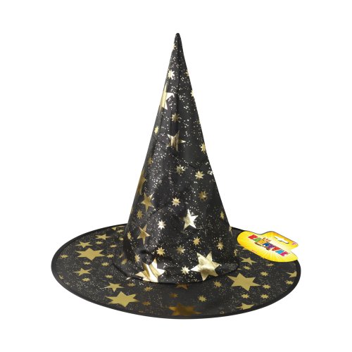 Úžasný čarodejnícky klobúk v čiernej farbe s potlačou zlatých hviezdičiek. Ideálne aj na halloweensky večierok alebo karneval!