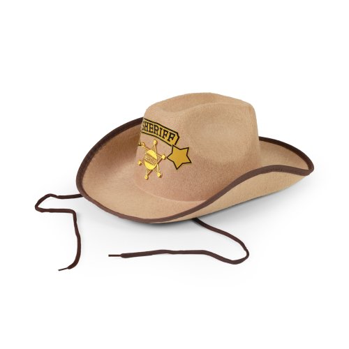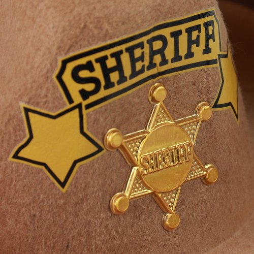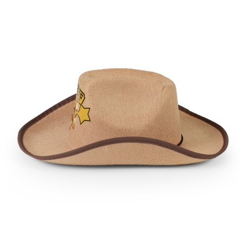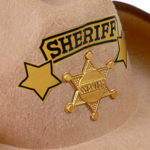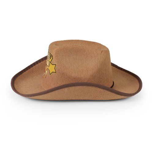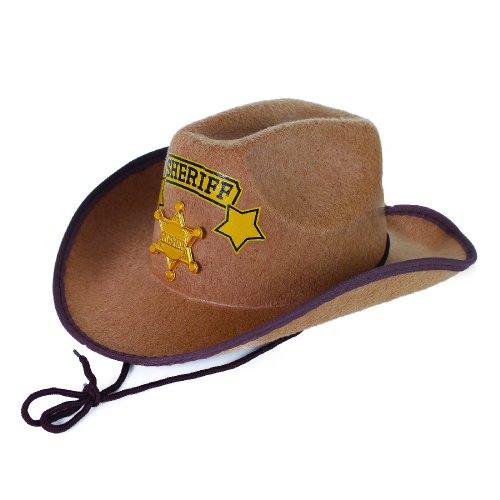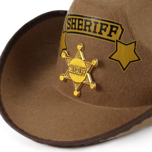 Štýlový klobúk pre všetky malé kovboje! Klobúk hnedej farby je zdobený zlatou šerifskou hviezdou a doplnený nápisom SHERIFF. Súčasťou klobúka sú aj šnúrky.