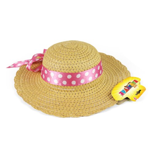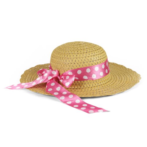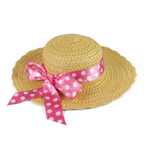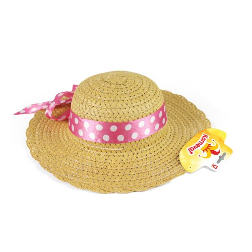Krásny slamený klobúk pre malé parádnice. Tento parádny kúsok je navyše zdobený ružovou stužkou s bielymi bodkami. Obvod klobúka je cca 53 cm.