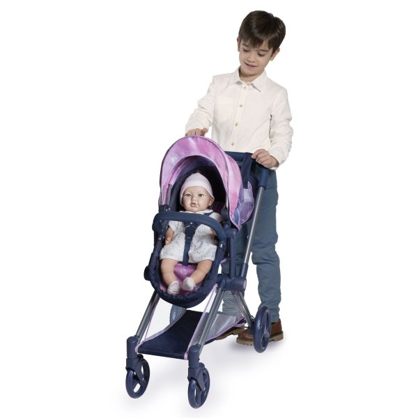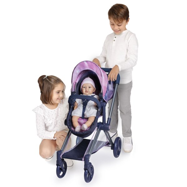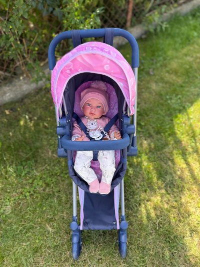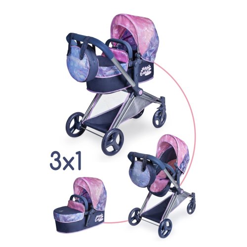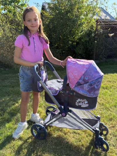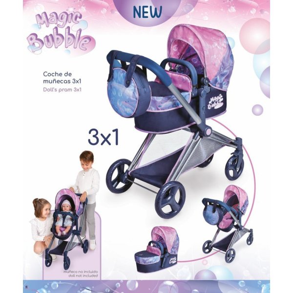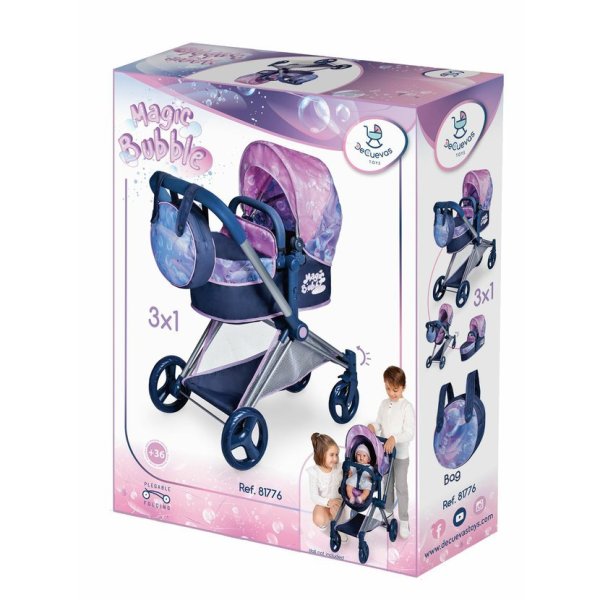 DeCuevas 81776 Skladací kočík pre bábiky 3 v 1 s taškou Magic Bubble 2024 – 73 cm, z rovnomennej kolekcie, ktorá je novinkou roku 2024, je vďaka vyššej rukoväti a kombinovanej funkcii hlbokého a športového kočíka skôr vhodný pre slečny predškôl. Obdiv si tento kočík právom zaslúži za svoj dizajn, ktorý dokonale kopíruje dnešné moderné reálne detské kočíky celosvetovo známych značiek ako je napríklad Cybex Priam. Výhodou je aj odnímateľná prenosná vanička, v ktorej je možné bezpečne prenášať bábiku. Po zložení nezaberá veľa miesta a je praktický aj na prevoz autom. Farebná kolekcia Magic Bubble pracuje s nežným dúhovým efektom. Od ružovej plynule prechádza vo svetle fialovomodrú, aby v závere končila kráľovskou modrou. Hravé bublinky sprevádzajú celú kolekciu. Okrúhla závesná taška na kočík, ako tvarom, tak dizajnom, podporuje názov celej kolekcie Magic Bubble. Aplikácia tematického Magic Bubble loga výrazne vyniká a zdobí na tmavomodrom pozadí materiálu. Táto kolekcia sa zrodila v spolupráci českých návrhárov a španielskeho výrobcu DeCuevas Toys. Kolekcia Magic Bubble ponúka niekoľko rôznych druhov kočíkov. Nádherný španielsky dizajn, precízne spracovanie. Skladací model, veľmi ľahká manipulácia počas samotnej hry. Materiál: kov, plast, textil. Balené v krabici vo farbách kolekcie. Odporúčaný vek od 3 rokov.
