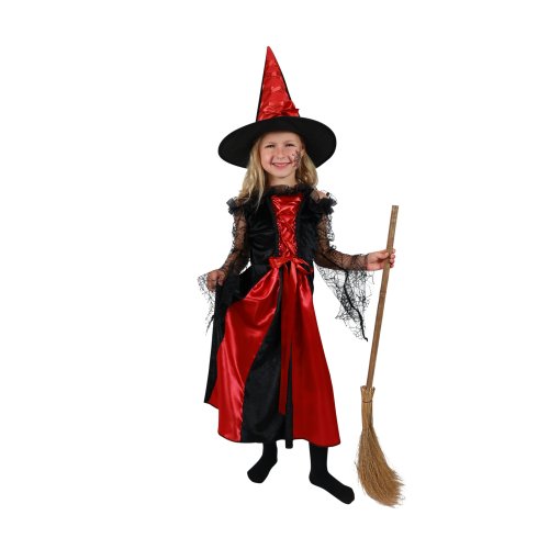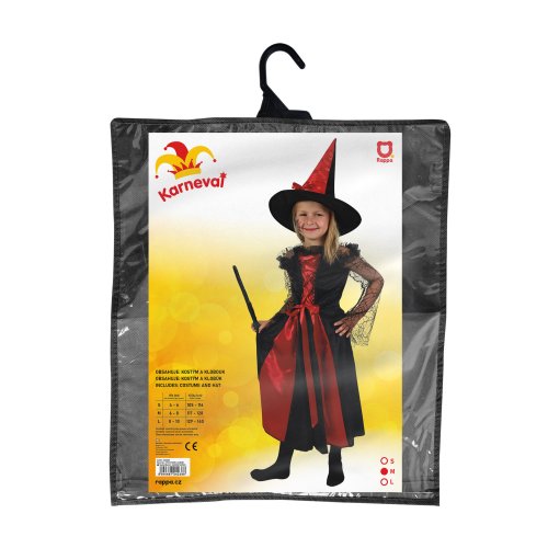 Roztomilý karnevalový kostým čierno-červenej farby urobí radosť každému dievčatku! Súprava obsahuje šaty s pavučinkovými rukávmi a klobúk s mašľou. Set vo veľkosti M je určený pre dievčatká vo vekovom rozmedzí 6-8 rokov (117-128 cm). Vhodný aj na oslavu Halloweenu! Metla ani palička nie sú súčasťou balenia.