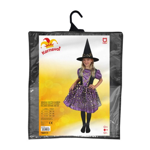 Nádherný kostým na Halloween pre všetky malé čarodejnice! Kostým fialovo-čiernej farby vo veľkosti M je určený pre dievčatká vo vekovom rozmedzí 6-8 rokov (117-128 cm). Šaty sú dekorované zlatou potlačou. Súčasťou kostýmu je perfektne zladený čarodejnícky klobúk. S týmto úchvatným kostýmom sa zaručene staneš hviezdou karnevalu aj Halloweenu!