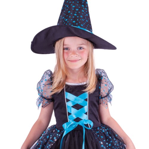 Parádny karnevalový kostým s motívom čarodejnice! Kostým modro-čiernej farby vo veľkosti S je určený pre dievčatká vo vekovom rozmedzí 4-6 rokov (105-116 cm). Šaty sú zdobené tyrkysovo modrou stuhou a metalickými hviezdičkami. Súčasťou balenia je perfektne zladený klobúk, ktorý je taktiež zdobený modrými hviezdičkami a stuhou. Staň sa hviezdou karnevalového alebo Halloweenskeho večierka!