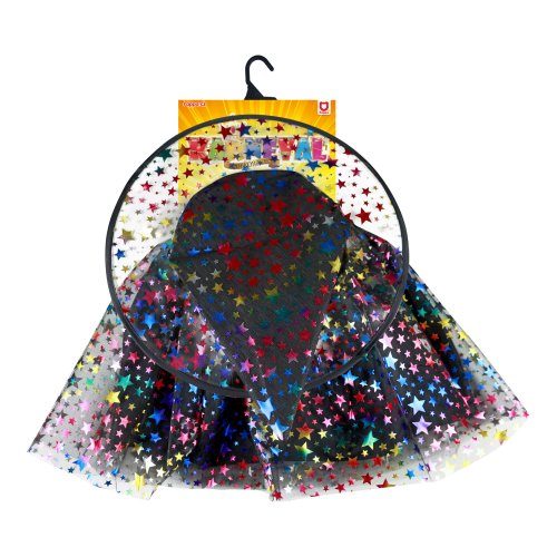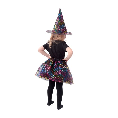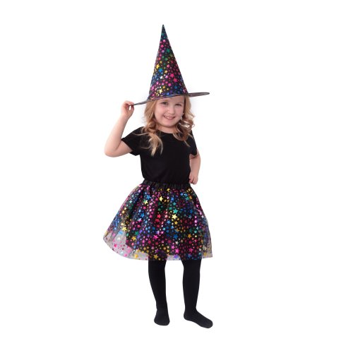 Magický kostým pre malé čarodejnice v čiernej farbe, zdobený farebným dekórom hviezdičiek. Kostým je určený pre dievčatká vo vekovom rozmedzí 3-7 rokov. Balenie obsahuje nadýchanú sukničku ak tomu perfektne zladený klobúk. Dĺžka sukienky je cca 30 cm. Sukňa je v páse na gumičku. Vhodný aj na oslavu Halloweenu.