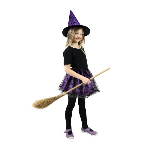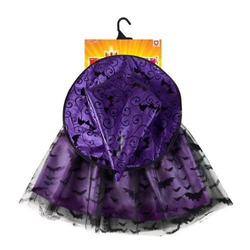 Magický kostým pre malé čarodejnice vo fialovej farbe, zdobený čiernou potlačou netopierov. Kostým je určený pre dievčatká vo vekovom rozmedzí 3-7 rokov. Balenie obsahuje nadýchanú sukničku ak tomu perfektne zladený klobúk. Dĺžka sukienky je cca 30 cm. Sukňa je v páse na gumičku. Vhodný aj na oslavu Halloweenu.